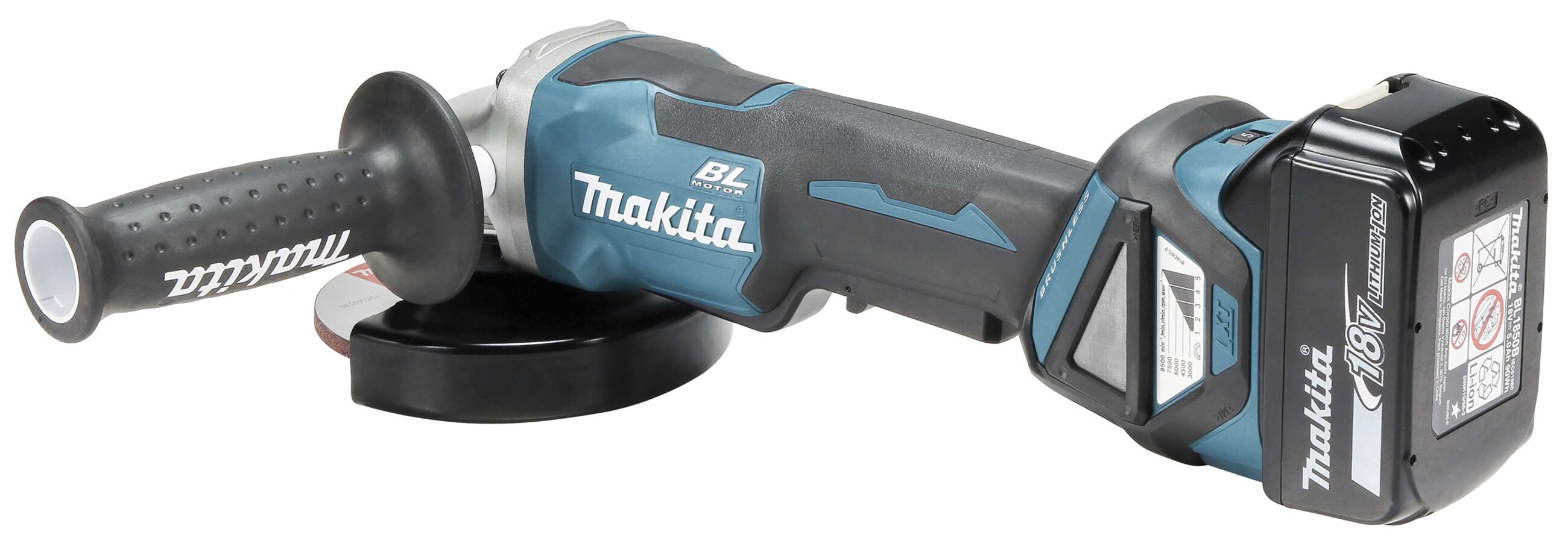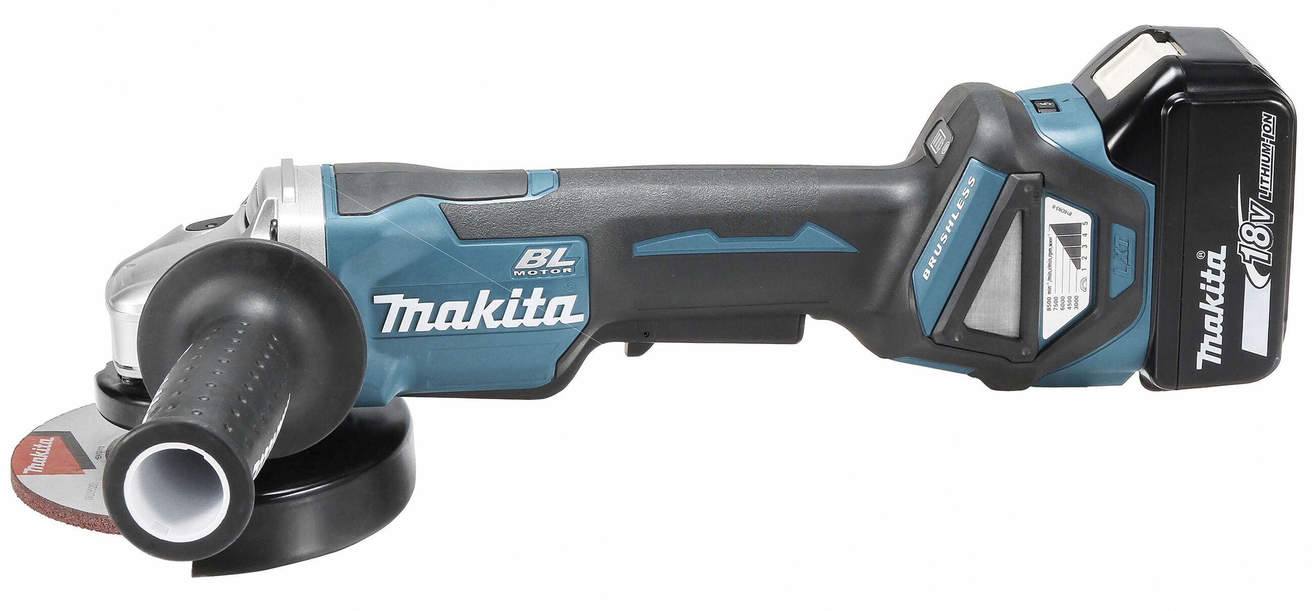 Leistungsfähiger Winkelschleifer mit bürstenlosem Motor und einstellbarer Drehzahl zum Trennen und Schleifen. Mit Paddelschalter